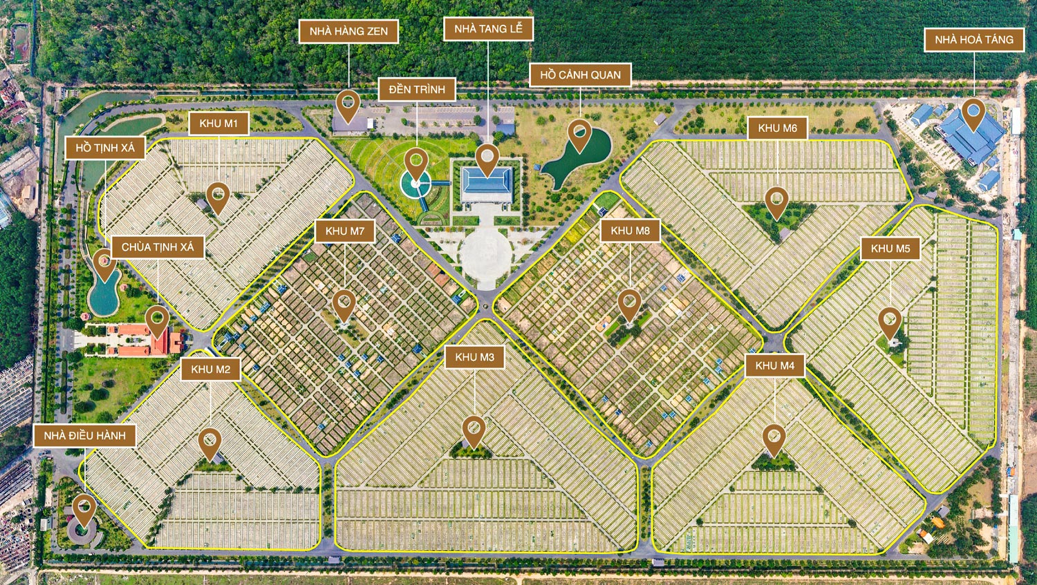 - Mật độ xây dựng: 50% xây dựng phần mộ, 50% mảng xanh và tiện ích tâm linh nội khu