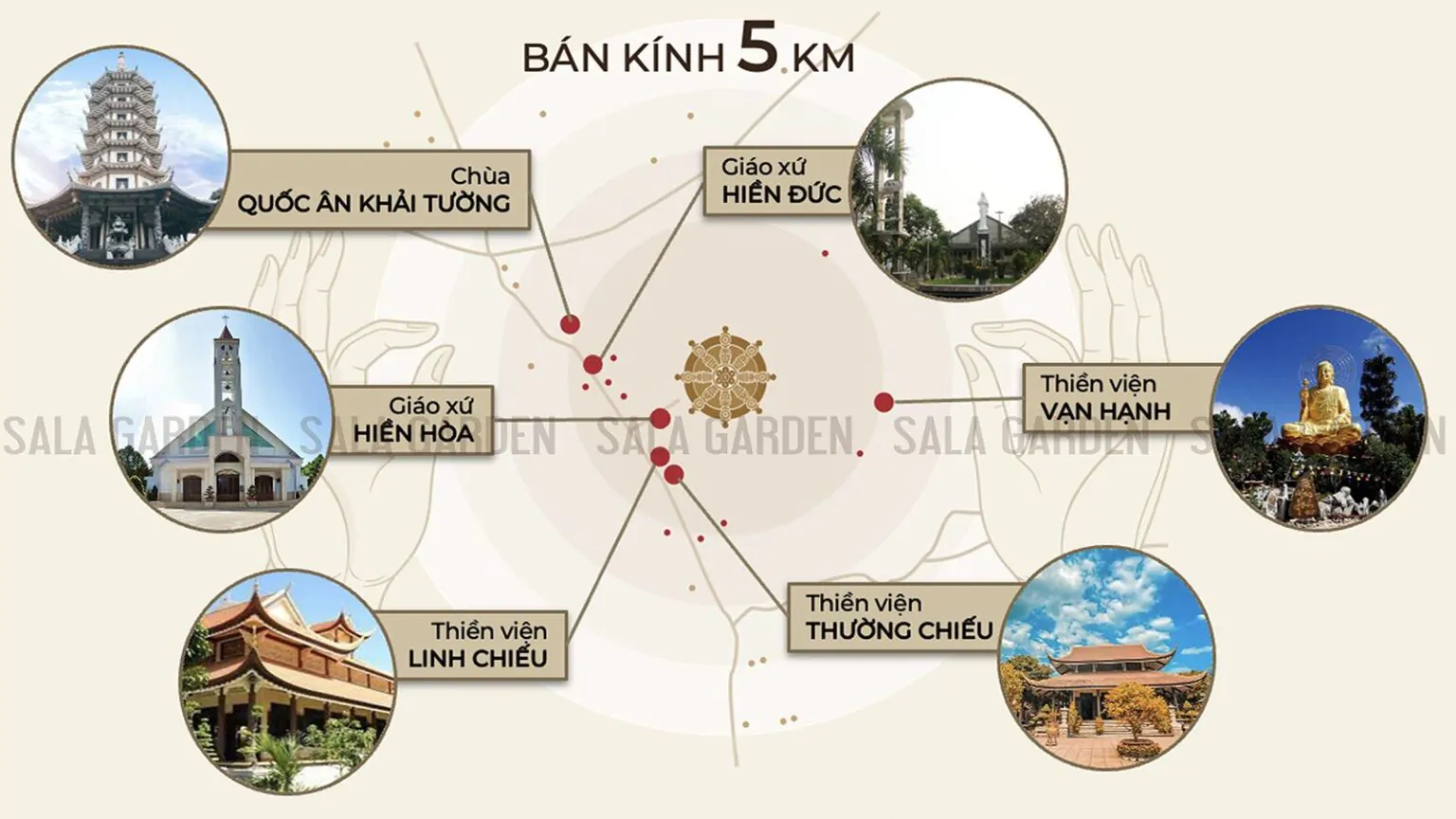 Sala Garden là hoa viên duy nhất trên cả nước được bao bọc bởi hơn 50 ngôi chùa, thiền viện, giáo xứ. Có thể thấy, đây là vùng đất quy hoạch lâu dài bền vững và Sala Garden sẽ không có khả năng bị di dời về sau.